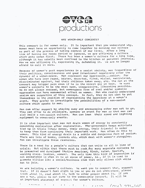 --/--/1975 | Why Women-Only Concerts? | Oven Productions, Cleveland OH (historical origin of women-only concerts) |